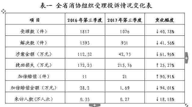 2017年三季度,全省消协组织共受理投诉咨询3726件,其中投诉1076件,解决931件,投诉解决率86.52%,为消费者挽回经济损失215.76万元。其中,因经营者有欺诈行为得到加倍赔偿的投诉21件,加倍赔偿金额1.69万元,接待消费者来访和咨询0.27万人次。(见表一)
