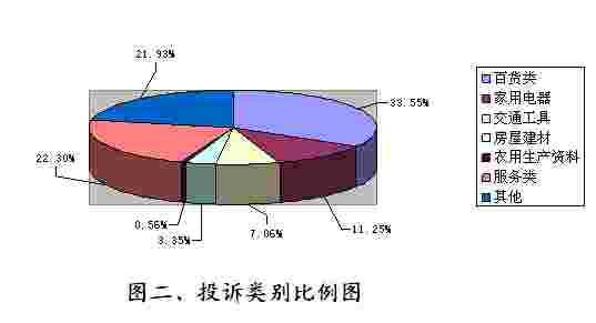 按投诉类别分析具体为:百货类361件;服务类240件;家用电器类121件;房屋建材类36件;农用生产资料类6件;交通工具类76件;其他类236件。(见图二)