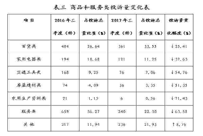 商品和服务类别投诉数据变化比率。(见表三)