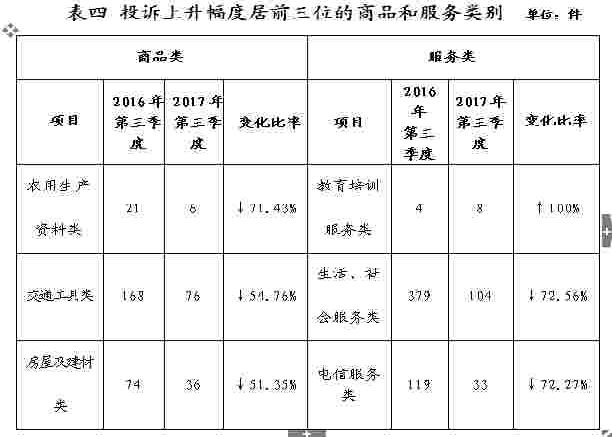 2017年三季度,投诉量同比变化幅度最大的商品类别是农用生产资料类、交通工具类、房屋及建材类;同比变化幅度最大的服务类别是教育培训类、生活社会服务类、电信服务类。(见表四)
